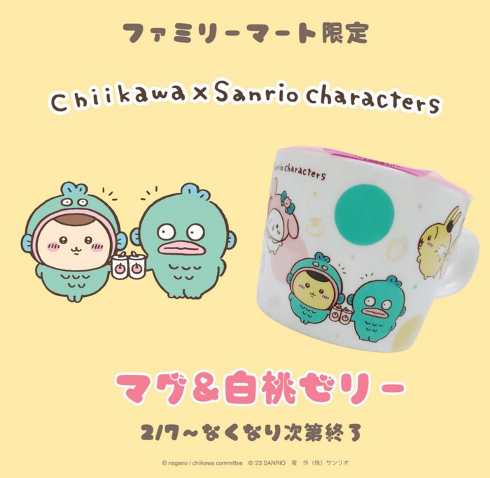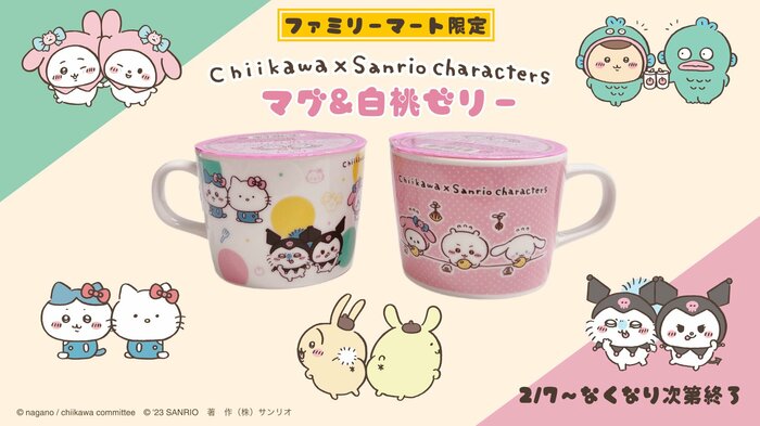 2月7日(火)から「ちいかわ×サンリオキャラクターズ」デザインのマグカップ付き白桃ゼリーが数量限定で登場。マグカップのデザインは2種類。どちらのデザインもかわいくて、迷ってしまいますね。