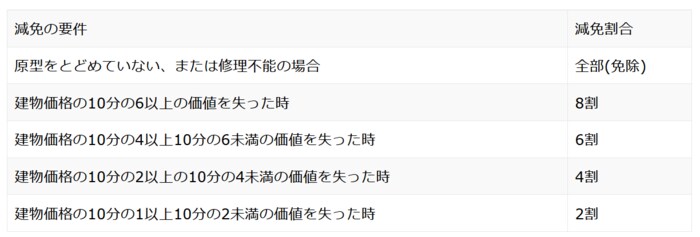損害の大きさに対しての減免割合は、各自治体によって異なりますので、各自治体の規定を確認しましょう。参考までに、大阪府堺市の自治体において定められている、家屋の損害に関する要件と減免割合は以下の通りです。