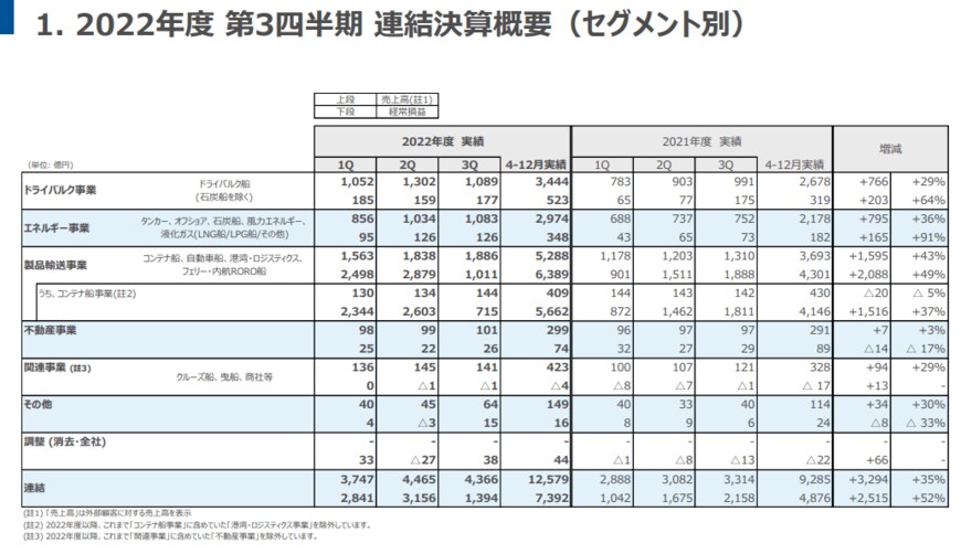 まず、2022年度第三四半期までの業績は、持分適用会社のOCEAN NETWORK EXPRESS PTE. LTD.(通称「ONE」)も含めた経常利益で見ると、前年同期比で2515億円の増益となる、7392億円となっております。