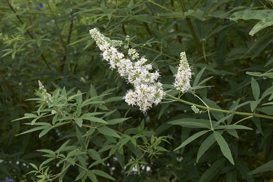 パープルやピンク、ホワイトの色合いがオシャレなセイヨウニンジンボク。園芸品種「プルプレア」はパープルの花と銅葉が大人っぽい雰囲気の人気品種で、玄関先にもオススメです。