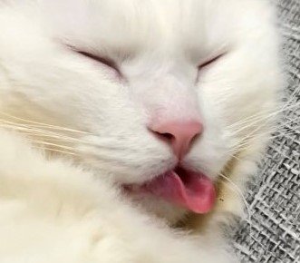 白くてモフモフの口元から、色鮮やかなピンク色の「舌」を大胆に覗かせています。
