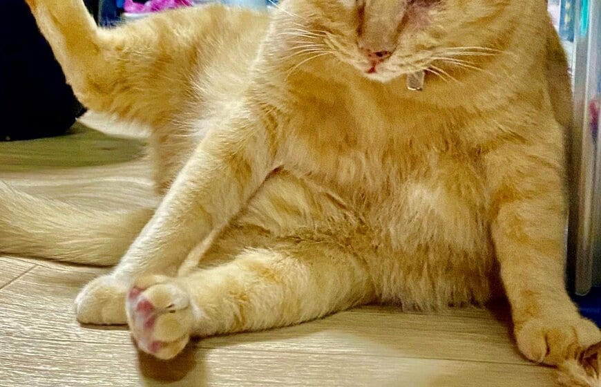 片足を上げて両手を床に付け、「おっとっと……」といった具合でバランスをとっているようです。口元からはほんの少しだけ舌が覗いているように見えますね。毛づくろいに夢中になっていたのでしょうか……!