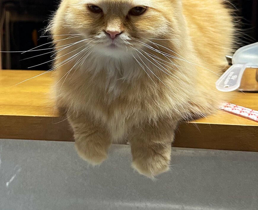 表情こそ険しいものの、カウンターからちょこんと出した両手や、体のフワッとした毛から可愛らしさがただよう猫ちゃん。癒しと面白さが詰まった1枚に関心を寄せた人は多いようです。