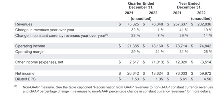 2022年第4四半期決算の売上高は前年同期比1%増の760億4800万米ドルでした。当期純利益は2021年第4四半期は206億4200万米ドルでしたが、2022年第4四半期は136億2400万米ドルに下がっています。