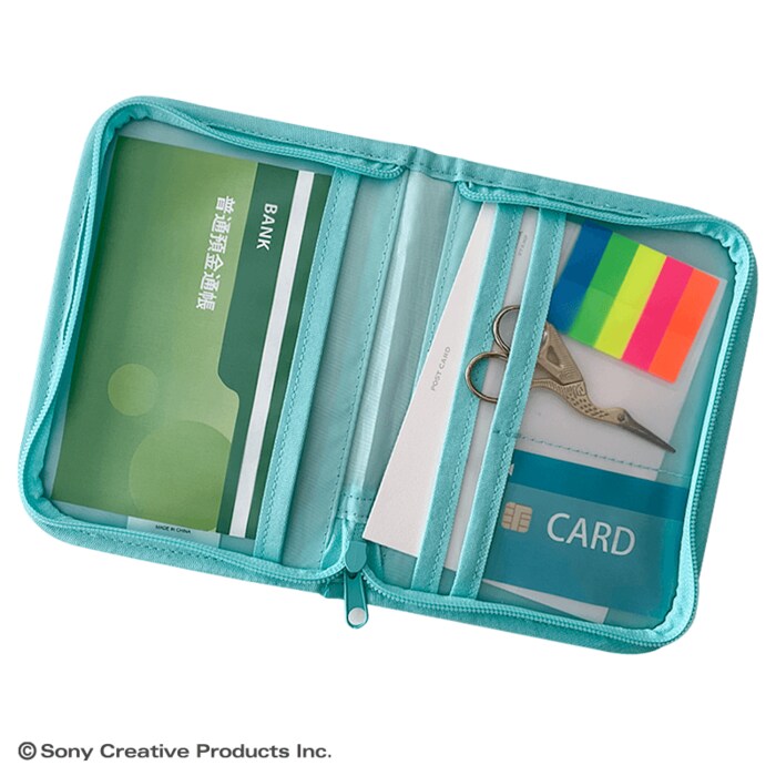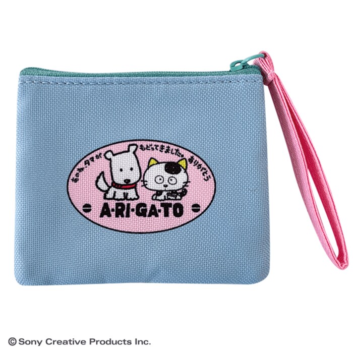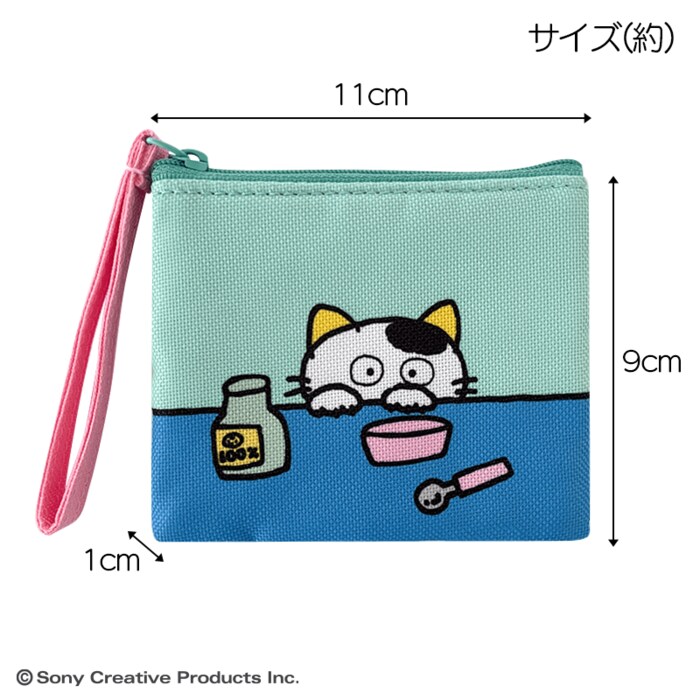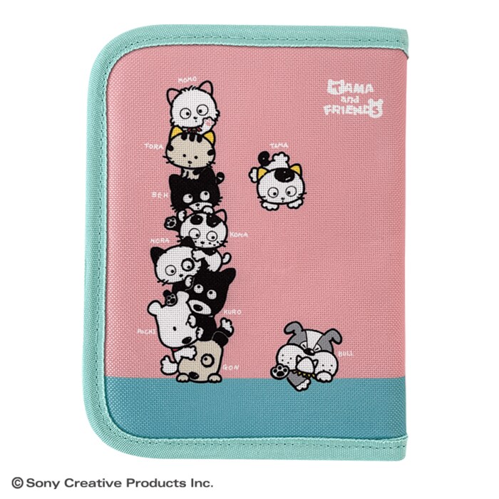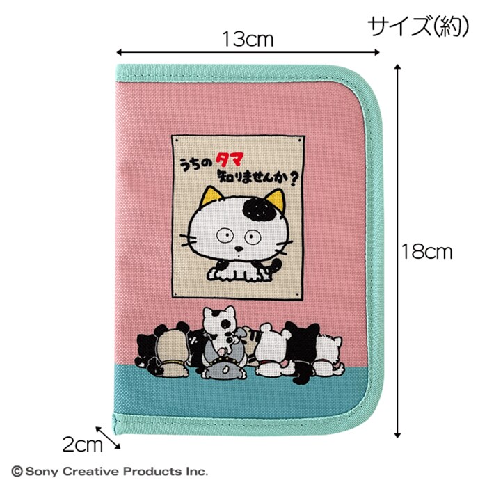 通帳やカード、小物などが入れられるファスナー付きのマルチケースです。表面には昔なつかしい「うちのタマ知りませんか?」のポスターを仲間たちが眺めているデザインです。