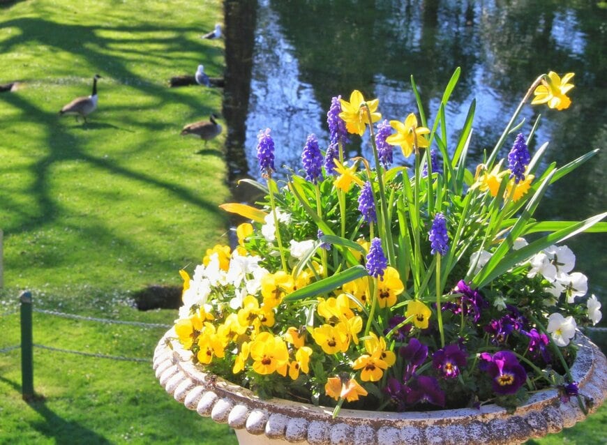 ブルーとイエローの反対色を組み合わせた配色が鮮やか。お互いの色合いを引き立て合っています。中央に背丈の高いムスカリとスイセンを配置したことで、高低差がある寄せ植えに。