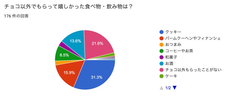 合同会社ボーダレスワールドの調査によると、チョコ以外で「もらって嬉しかった食べ物・飲み物」として、クッキーやバームクーヘンなどの洋菓子が上位となりました。