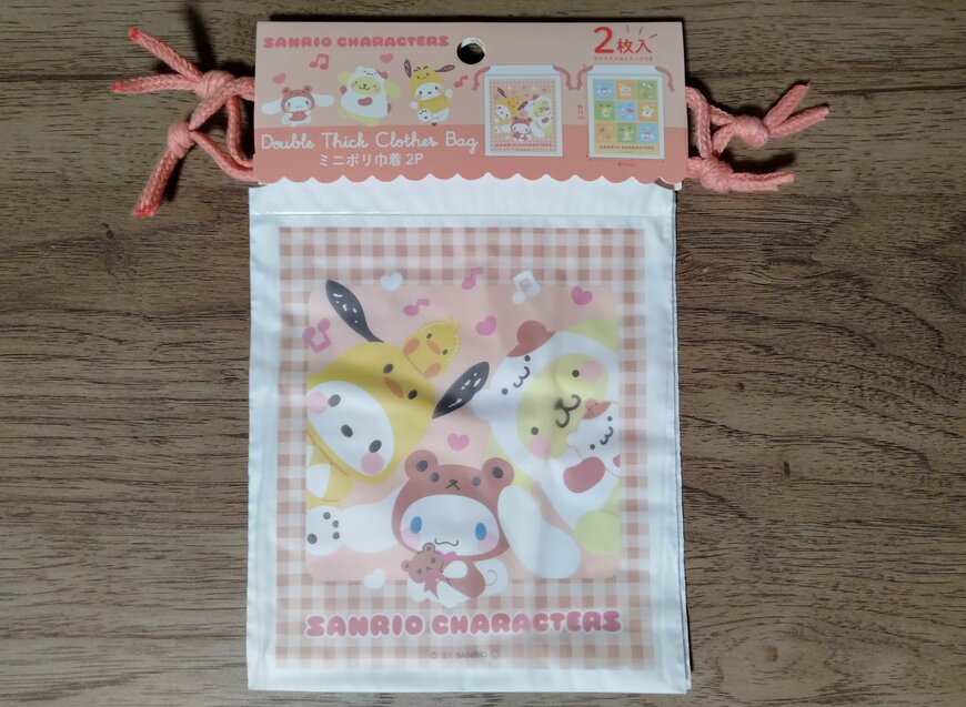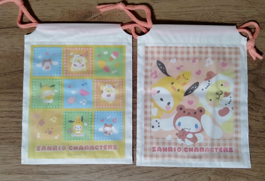サンリオのキャラクターアイテムというと高価なイメージがあるので、デザイン違いの巾着が2枚セットで110円(税込)というのはコスパが良いと感じます。