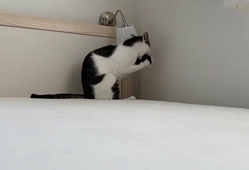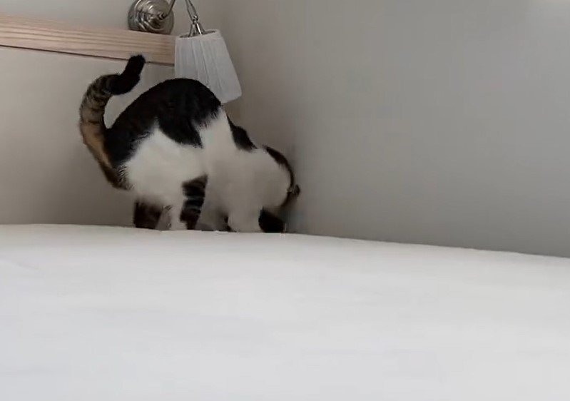 話題になったのは、保護猫の男の子「セロイ」くんです。動画の冒頭には、カメラに背を向けながら、ベッドと壁の間に頭を入れてガサゴソするセロイくんの姿がありました。