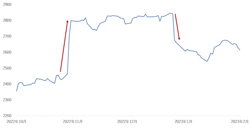 2022年10月以降のJTの株価推移を終値で見ていくと、10月31日(2464円)から11月1日(2698円)にかけて終値ベースで+9.5%高となり、12月28日(2843円)から12月29日(2676円)にかけて同-5.9%安となり、この二つのタイミングで大きく株価が変動しました。