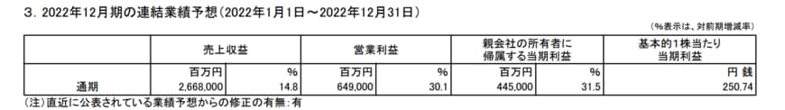もう一つは堅調な業績で、同決算説明会においては2022年度通期の業績見通しを上方修正し、当期利益の見通しを4450億円(前年比+31.5%)としました。