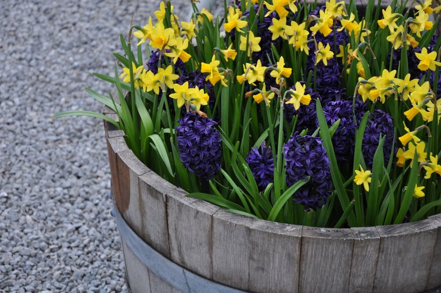 おとなしい草姿のスイセンと、ゴージャスな雰囲気のヒアシンスという組み合わせも対照的でオシャレ。どちらもすばらしい芳香を持つ植物なので、美しさと香しさの両方を満喫できるでしょう。