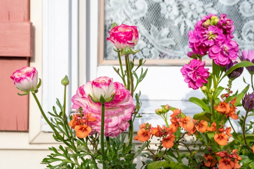 ストックやネメシアも寒い時期から出回り、冬の花壇を華やかに演出してくれる一年草。ストックは甘い香りも魅力的。ラナンキュラスとともにゴージャスな花姿が人目を引きます。