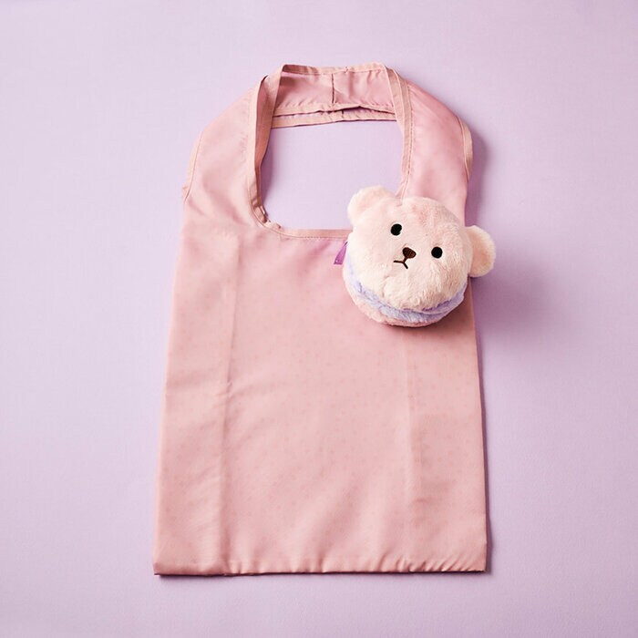 もこもことしたクマさんデザインのポーチに、エコバッグが入っているセット商品です。かわいらしい印象のクマさんは、クリームをサンドしたマカロンをイメージして作られており、厚みがあるリッチでおしゃれな見た目。見ているだけでテンションが上がる、かわいいもの好きにはたまらないエコバッグです。エコバッグとポーチの色味も統一感があり、細部にまでデザイン性にこだわっています。