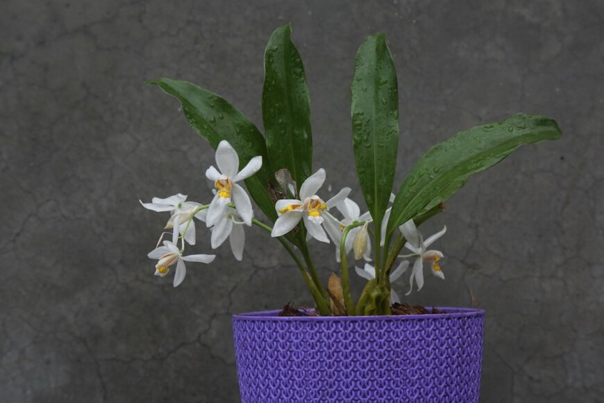 ミニ洋ランは着生タイプなので、花姿はゴージャスというよりどちらかというと控えめで可憐。また個性的な姿の葉や、ヒョロリと伸びる気根は野趣にあふれています。