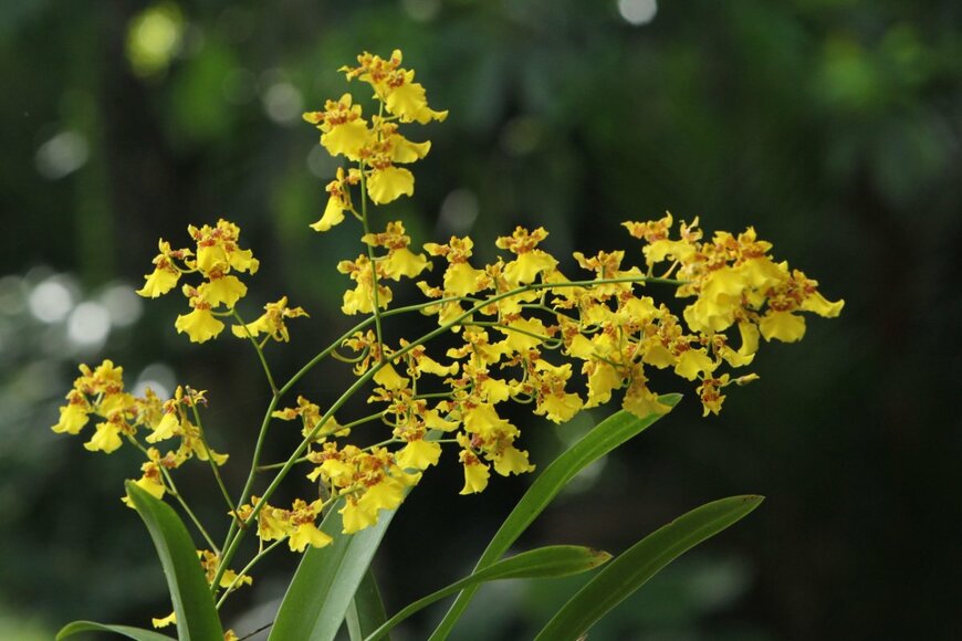 明るいイエローの小花が散りばめられたように咲くオンシジウム。フリルのような花弁が愛らしく、ほかに白や紫、ピンク色も改良品種として登場しています。