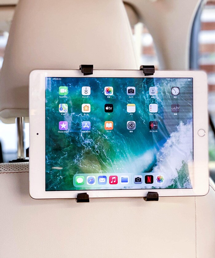 車のヘッドレストに取り付けるだけで、簡単にタブレットで動画やゲームを楽しめます。360度回転するので、見たい角度に調整して視聴できます。キッズとの長時間ドライブも快適にしてくれそうですね。
