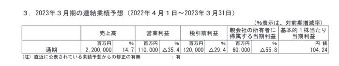 それによると、2023年3月期の通期予想は売上高が2兆2000億円、営業利益が1100億円(前期比▲35.4%)となっています。