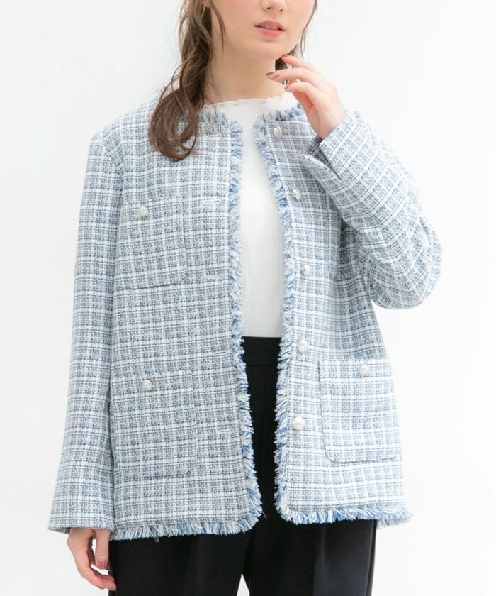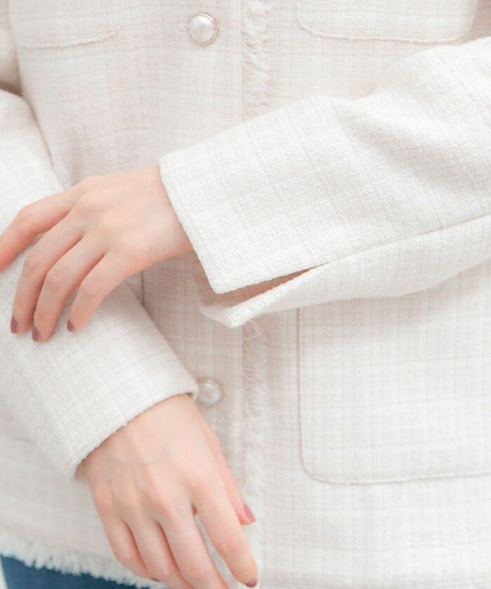 こちらがハニーズの新作の「ツイードジャケット」です。ノーカラーのすっきりとしたデザインが魅力です。