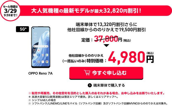 同セールでは、OPPO Reno7 Aが対象となっています。