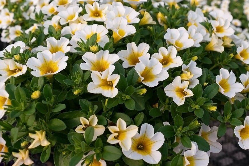 ペチュニアによく似た小ぶりの花を咲かせるカリブラコア。花が小さく可憐な雰囲気ですが、株いっぱいに花をつける姿は、ペチュニアに負けないほどの華やかさです。