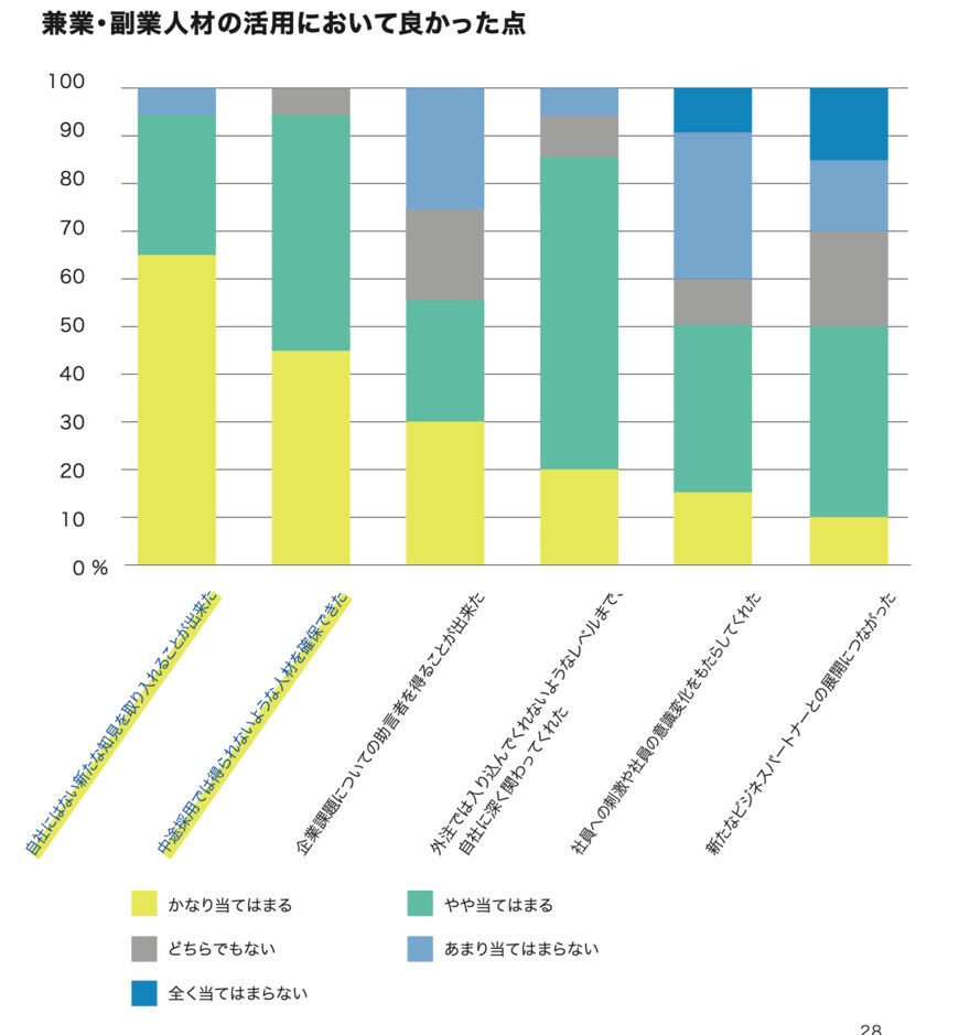 実際に、経済産業省が行った兼業・副業人材に関するアンケート調査では、兼業・副業人材の活用において良かった点として、「自社にはない新たな知見を取り入れることが出来た」と回答している企業が大多数となりました。