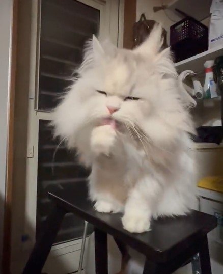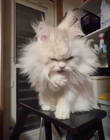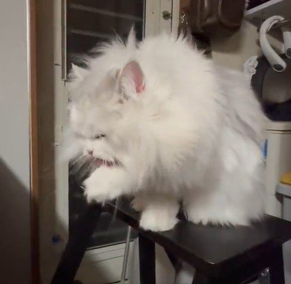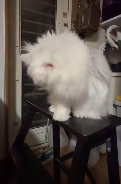 この日は、台の上に乗って毛づくろいに夢中だった様子。白くてフサフサとした長毛が印象的なノーマンくんですが……?