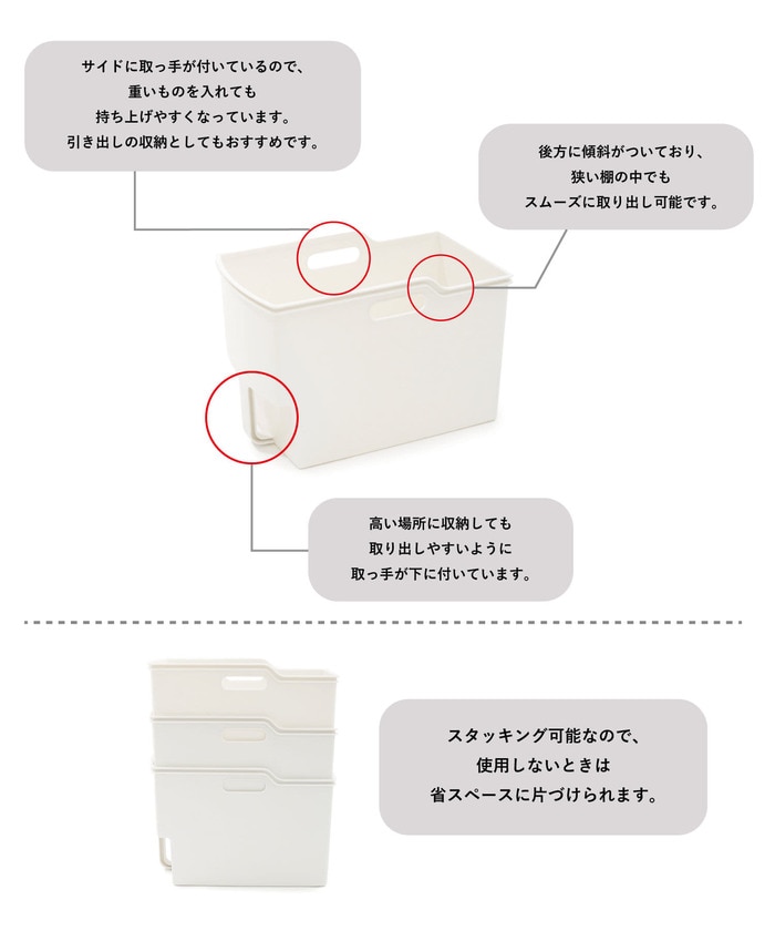 また、両サイドに取っ手穴があり、重たいものを入れて運ぶ際に両手で持つことができて便利です。シンプルなデザインなので、お部屋に馴染むスタイリッシュさもうれしいですね。使用しないときは、スタッキングができるので省スペースで場所を取らない、優れモノです。