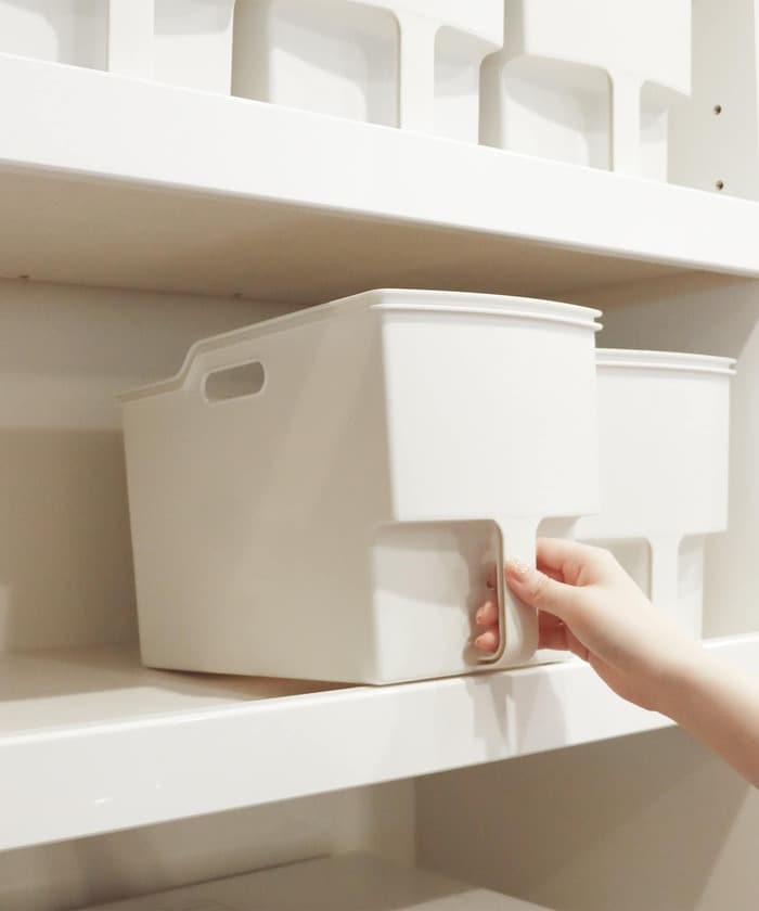 生活感の出やすい日用品や調味料、お部屋の小物や備品をすっきり収納できる戸棚用ボックスです。本体下部に取っ手が付いているので、吊戸棚に置いても簡単に引き出せるアイデア商品。