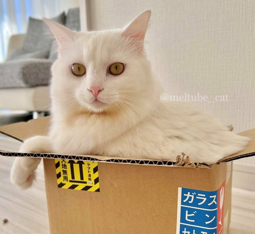 モフモフのボディは、段ボール箱から「モッフリ」とはみ出ていますね。箱と体のフィット感がよく伝わってきます。カッコイイ表情と少々シュールな格好とのギャップに、思わず笑みがこぼれてしまいました。