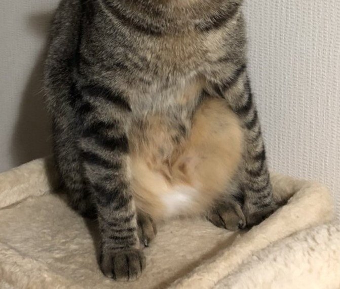 足を折りたたんでしゃがんでいるようですが、手は両足の側面で着地しています。なんとも可愛いモコモコのお腹が丸見えになっています!