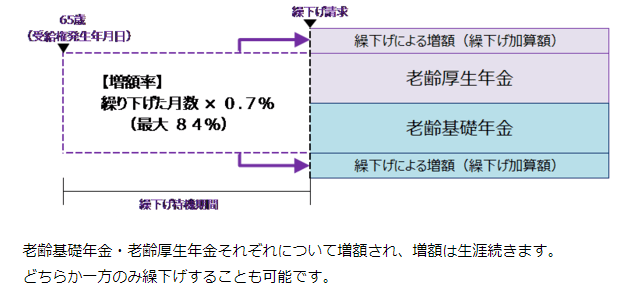 この年金受給開始のタイミングは「60歳~75歳」までの間でずらすことができます。受け取り始める時期を後ろ倒しする「繰下げ受給」を行うと、繰下げた月数に応じた増額率が適用され、75歳(120カ月)まで繰下げた場合、年金が84%も増えるのです。
