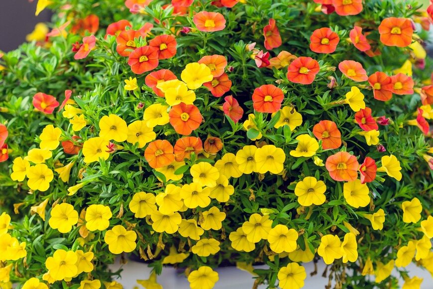 風にそよぐヒラヒラした花びらと、色鮮やかな花色が人気のカリブラコア。春から秋にかけて長期間楽しめる一年草で、ペチュニアに似たコンパクトな花を咲かせます。