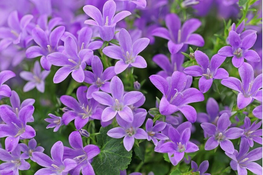 パープルの釣り鐘型の花を咲かせるベルフラワー。株いっぱいに咲く小花は落ち着いた色合いで、大人っぽい趣が感じられます。