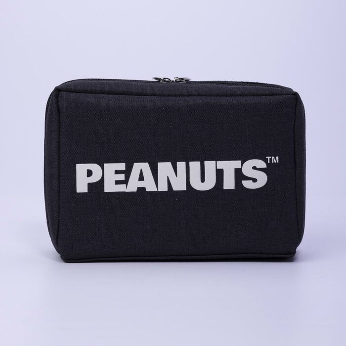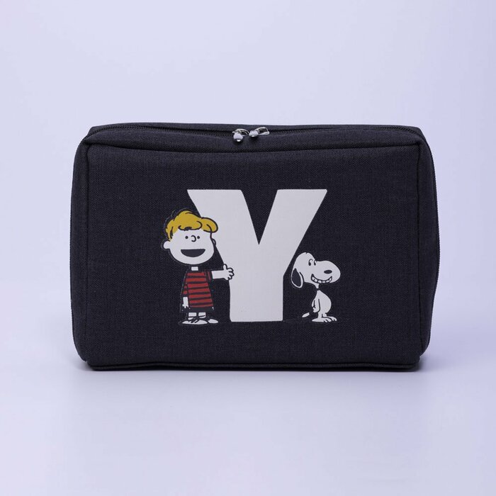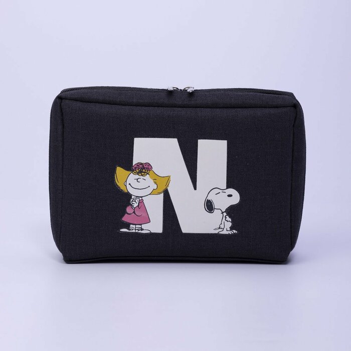 こちらはブラック地に大きなホワイトのイニシャルが映えるポーチ。各イニシャルにはスヌーピーをはじめとした『PEANUTS(ピーナッツ)』の仲間たちがあしらわれています。2つの引手で大きく開き、さらに内ポケットつきで小物の整理がしやすい使い勝手も◎なアイテムです。シックなデザインなので性別や年齢を問わず愛用できそうですね。