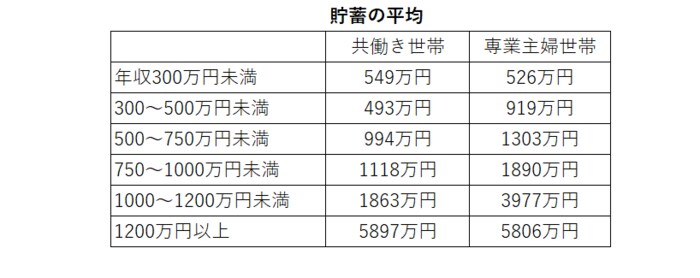 平均貯蓄額を確認すると、年収300~1200万円未満までは共働き世帯に比べて、専業主婦世帯のほうが貯蓄が多い結果となりました。