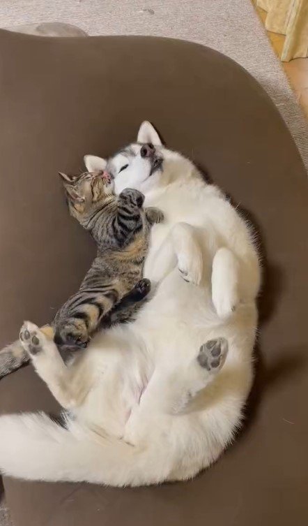 投稿された動画には、保護猫の「サン」くんと、ハスキー犬の「ユキ」ちゃんの姿が写っています。ユキちゃんはサンくんにとって母親のような存在だといい、2匹は日頃からピッタリ密着して眠っていることが多いようです。