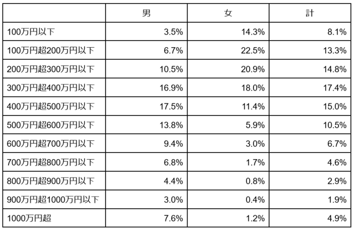 国税庁「令和3年分 民間給与実態統計調査」によると、年収「600万円超700万円以下」は男女別では男性9.4%、女性3.0%でした。