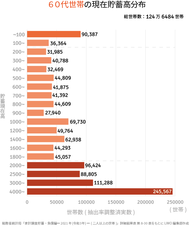 2021年の家計調査によると、60~69歳の2人以上世帯のうち、貯蓄現在高が4000万円以上ある世帯は、24万5567世帯となっています。