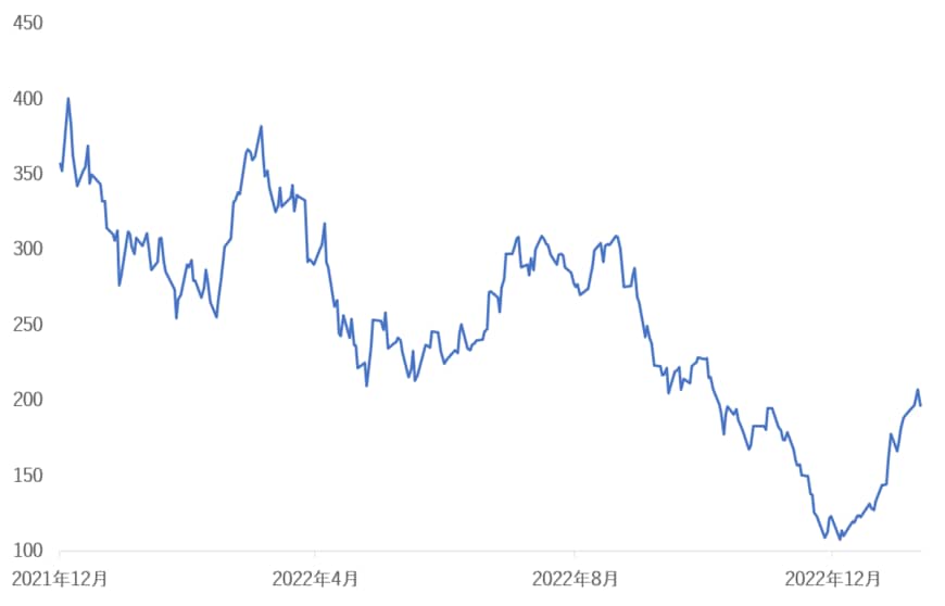 一時399.92ドル(2022年1月3日終値)に迫った株価は、2022年末には109.1ドル(2022年12月27日終値)付近まで低下し、約73%も下落した状況です。