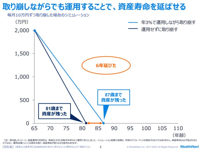 しかし、仮に年3%の利回りで運用しながら取り崩しをスタートすると、同じ元本を使い切る時期は、87歳まで延びます。この場合、資産寿命は6年延びることになり、毎月の取り崩しの額を減らせば、さらに使える期間を延ばすことも可能となります。