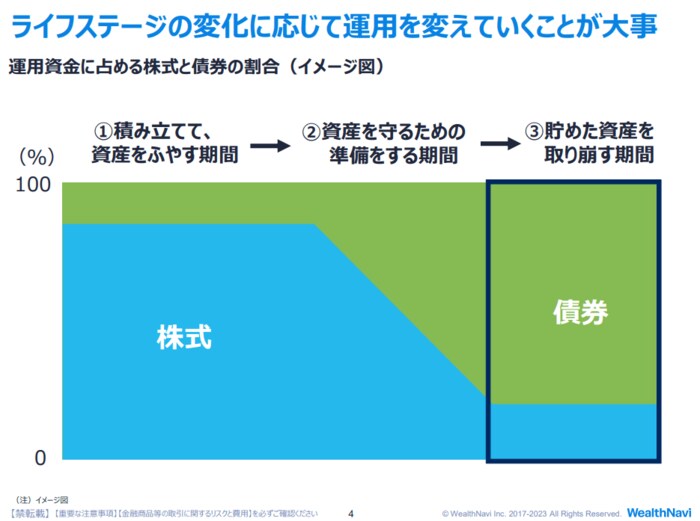 若いうちは、成長が見込める株式中心でポートフォリオを組んでも問題ありませんが、取り崩しの期間は、できるだけ資産を減らさないことが重要です。