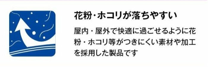 「花粉・ホコリ等がつきにくい素材や加工」がされている製品であることを意味します。花粉対策ウエアをチェックしたいときは、このマークの有無を確認してみましょう。