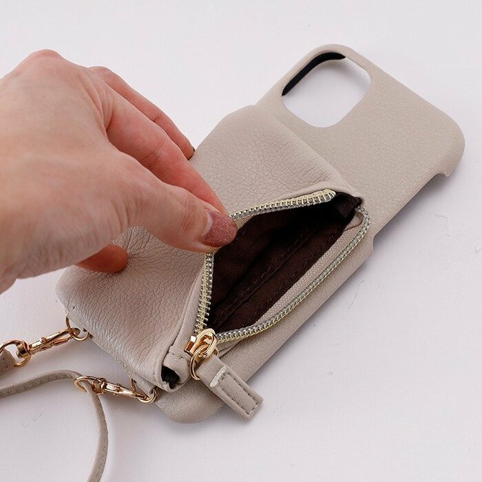 こちらは「iPhone11/XR」に対応しているスマホショルダーケースです。背面には、ファスナーポケットが付いています。