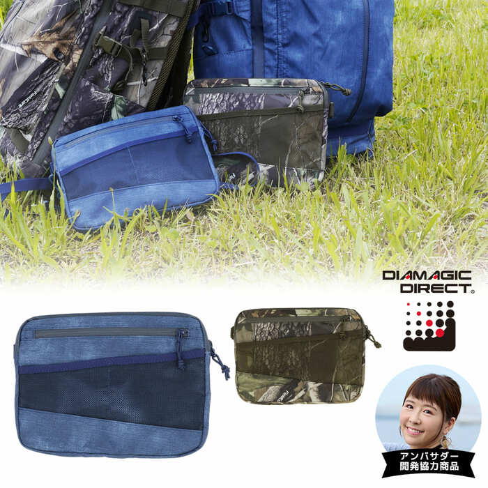 ポケットは、内側ポケット2つ・背面ボタン付きポケット・前面ファスナー付きポケット・前面メッシュポケット2つなどたっぷりで、ストラップ・Dカン付きという多機能。また、DIAMAGIC DIRECT(ディアマジック ダイレクト)(耐久撥水)なのもうれしいですね。