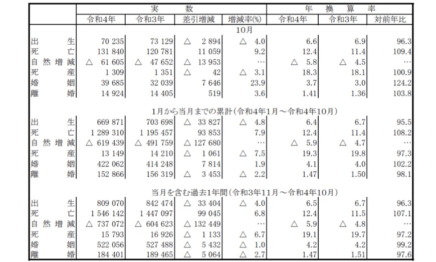 2022年11月〜12月分を含んだ結果はまだ公表されていませんが、このペースで推移した場合、出生数は80万人を下回る見通しです。