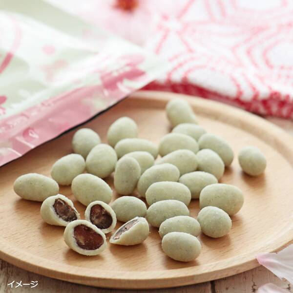 北海道十勝産あずきをふっくらやわらかい甘納豆にし、やさしくホワイトチョコでコーティングしています。さくら餅をイメージした、ほんのりしょっぱいさくら葉パウダーがおいしさを引き立ててくれますね。