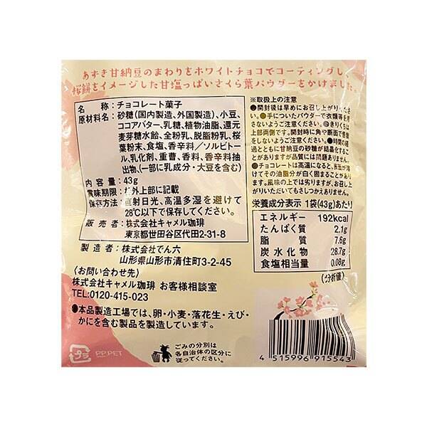 - 原材料名:砂糖(国内製造、外国製造)、小豆、ココアバター、乳糖、植物油脂、還元麦芽糖水飴、全粉乳、脱脂粉乳、桜葉粉末、食塩、香辛料/ソルビトール、乳化剤、重曹、香料、香辛料抽出物、(一部に乳成分・大豆を含む)