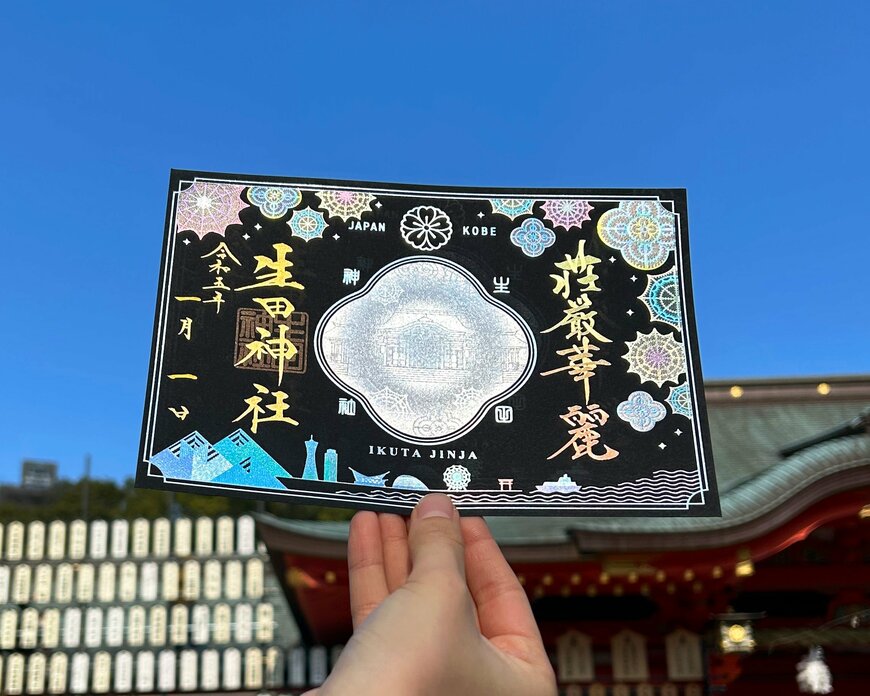 「四輝(しき)朱印 冬」は、四季が美しく移ろい光輝く様を「四輝」という言葉で表現。中央には幻想的に輝く社殿、その周りには彩り豊かなイルミネーションで光り輝く夜の神戸の街をデザインしています。