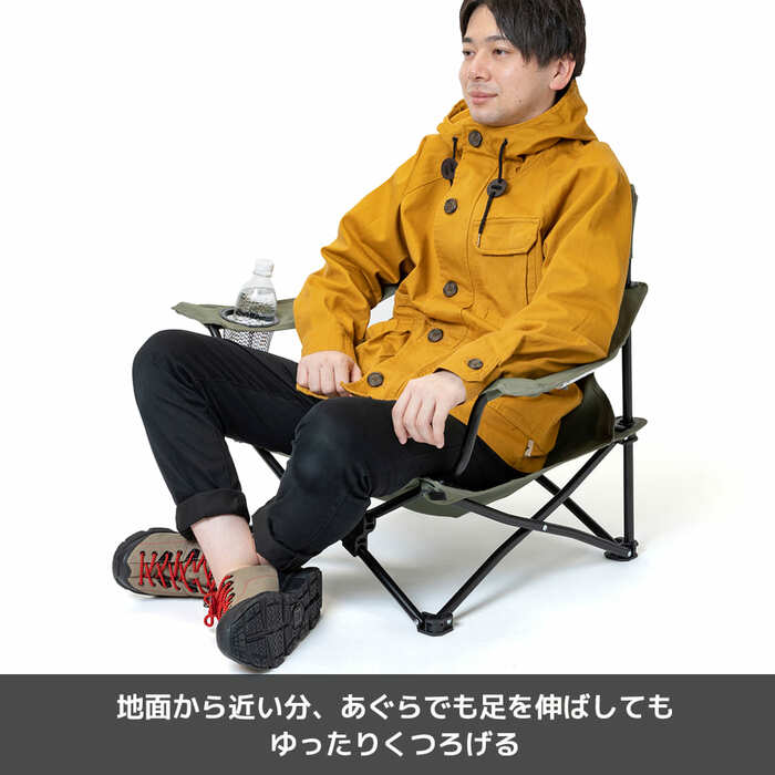 また、アームレストにはメッシュホルダーが付いており、スマホやボトルを入れることも可能。収納袋付きなので持ち運びも便利です。ゆったり座れて地面からの距離も近いので、足も少し伸ばしてリラックス出来る、まさに万能チェアといえそうです。